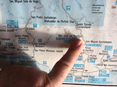 Tam, co je prstíček, právě jsme a míříme úplně dolů do Zipolite. Ráno jsme začali ve výšce 3200 metrů nad mořem a jedeme k moři.